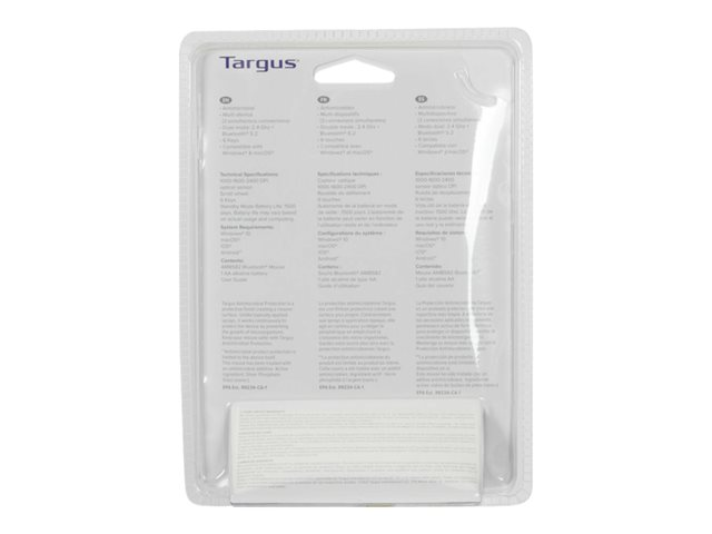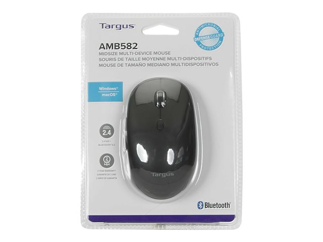 Description du produit Targus Confort multi-appareils de taille moyenne - souris - antimicrobien - Bluetooth, 2.4 GHz Type de périphérique Souris Technologie de connectivité Sans fil - Bluetooth, 2.4 GHz Résolution 2400 dpi Performances Commutation de sensibilité en temps réel 800/1 200/1 600/2 400 ppp Caractéristiques Protection antimicrobienne Batterie Type AA Système d'exploitation requis Apple MacOS, Microsoft Windows -