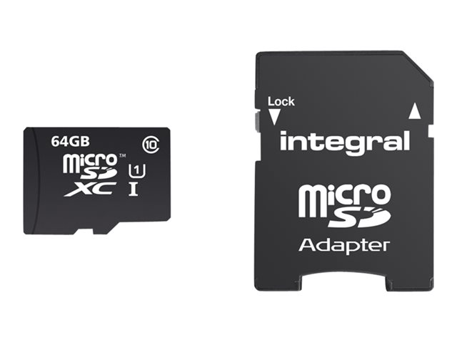 Description du produit Integral UltimaPro - carte mémoire flash - 64 Go - microSDXC UHS-I Type du Produit Carte mémoire flash Format Carte mémoire microSDXC UHS-I Capacité de stockage 64 Go Indice de vitesse UHS Class 1 / Class10 Adaptateur mémoire fourni Adaptateur microSDXC vers SD Garantie du fabricant Garantie de 5 ans -