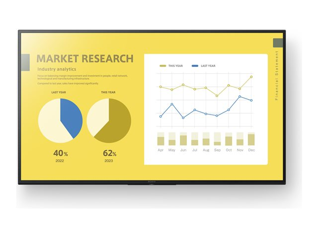Description du produit Sony Bravia Professional Displays FW-55EZ20L EZ20L Series - 55" écran LCD rétro-éclairé par LED - 4K - pour signalisation numérique Type de Produit Écran plat LCD rétro-éclairé par LED Classe de diagonale 55" Utilisation commerciale Oui - signalisation numérique Couleur Noir de jais Plate-forme Android TV Résolution 3840 x 2160 Format d'affichage 4K UHD (2160p) Formats vidéo d'entrée 480p, 720p, 1080i, 1080p, 4K UHD (3840 x 2160), DCI 4K (4096 x 2160) Format HDR HDR10 Technologie HDR Hybrid Log-Gamma (HLG) Taux d'image et technologie d'amélioration Technologie Motionflow XR Interface vidéo Composite, HDMI Nombre de ports HDMI 3 ports Connectivité Wi-Fi, LAN Technologie IPS Technologie de rétroéclairage LCD Direct LED atténuation des images Format de l'image 16:9 Tuner de télévision Pas de tuner Fonctions commerciales Prise en charge de HTML5, réveil automatique HDMI, BRAVIA Signage Free (BSF) 2.0 Améliorations d'image Couleur naturelle, X-Reality 4K Pro Engine, Grand angle de vue, 75 % de la gamme de couleurs DCI-P3 Système de haut-parleurs 2 haut-parleurs Capacité de stockage 16 Go USB 2 ports Consommation en fonctionnement 202 Watt Consommation électrique en veille 0.5 Watt Dimensions (LxPxH) - sans support 124.3 cm x 7.1 cm x 72.1 cm Poids 15.3 kg -