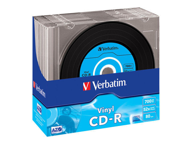 Description du produit Verbatim Data Vinyl - CD-R x 10 - 700 Mo - support de stockage Type Support de stockage - CD-R Nombre de supports inclus 10 Capacité normale 700 Mo Vitesse d'écriture 52x (maximum) Fonctions Revêtement Super AZO Type d'emballage Boîtier CD étroit -