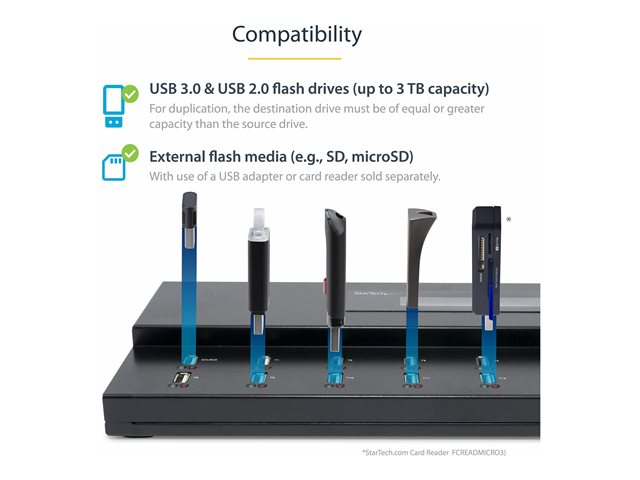 Ce duplicateur et effaceur USB vous permet de cloner ou d'effacer jusqu'à 15 clés USB sans connexion à un ordinateur hôte. Cela signifie que vous pouvez travailler plus efficacement et gérer de plus grandes quantités de clés USB, en moins de temps et avec moins d'efforts. Le duplicateur et effaceur USB autonome est parfait pour les informaticiens et les administrateurs système travaillant dans des environnements d'entreprises, d'établissements scolaires, marketing ou commerciaux.