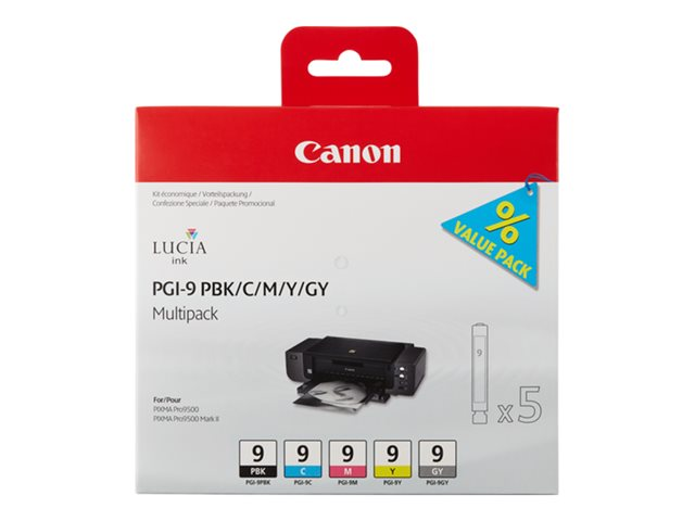 Canon PGI-9 PBK/C/M/Y/GY Multi-Pack - Pack de 5 - gris, jaune, cyan, magenta, photo noire - original - réservoir d'encre - pour PIXMA iX7000, MX7600, Pro9500, Pro9500 Mark II